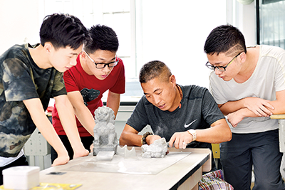 近年來,浙江桐廬縣通過鼓勵和支持技能傳承人積極參與工作室建設和各類帶徒傳技活動,帶動全縣技能人才隊伍不斷壯大。圖為鐘山石雕代表性傳承人周慧洪(右二)在指導徒弟制作石雕。