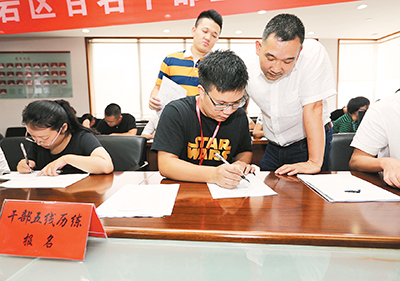 今年以來,浙江臺州市黃巖區啟動“五線歷練”行動,選派百名年輕干部到“改革發展、鄉鎮基層、項目建設、重點工作、服務群眾”五個一線掛職。圖為報名現場工作人員審核報名表。