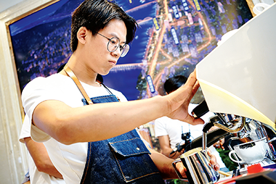 今年以來,浙江青田縣積極發(fā)揮僑鄉(xiāng)優(yōu)勢,啟動“咖啡小鎮(zhèn)”三年行動計(jì)劃,實(shí)施咖啡人才培養(yǎng)工程、咖啡品牌培育工程、咖啡商旅融合工程,通過規(guī)范制作流程、開展專業(yè)培訓(xùn)等方式,促進(jìn)當(dāng)?shù)乇就寥瞬排囵B(yǎng)。圖為該縣舉辦的首屆咖啡沙龍暨人氣咖啡師大賽上,咖啡師展示咖啡制作技能。