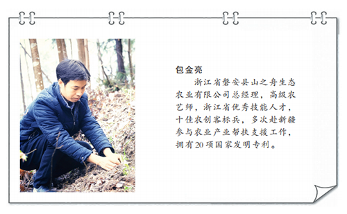 2001年,包金亮創辦磐安首家民營食用菌研究所,隨后創辦磐安縣山之舟生態農業有限公司,通過有機認證,成為磐安食用菌行業標準化生產的先驅,實現了低耗、高效、優質的集約化生產。包金亮精心選育的“新藝一號”香菇新菌株,被韓國、日本及國內20多個省市引進栽培。自主研發的“食用菌集約化栽培工藝與裝置”“便攜式食用菌消毒接種器”“節能食用菌蒸汽滅菌裝置”等20項發明先后獲得國家專利。目前,公司年栽培食用菌200萬袋,產值1000余萬元,產品出口韓國、美國、新西蘭等國家。
