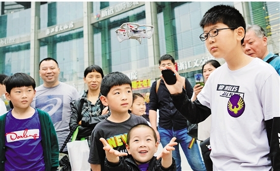 5月19日,2019浙江省科技活動(dòng)周在杭州西湖文化廣場(chǎng)開幕。能用手勢(shì)控制的無(wú)人機(jī)、大推力火箭的模型……這些熱門科技產(chǎn)品,展示了青少年科技創(chuàng)新成果。圖為杭州長(zhǎng)壽橋小學(xué)的同學(xué)在用手勢(shì)控制無(wú)人機(jī)。